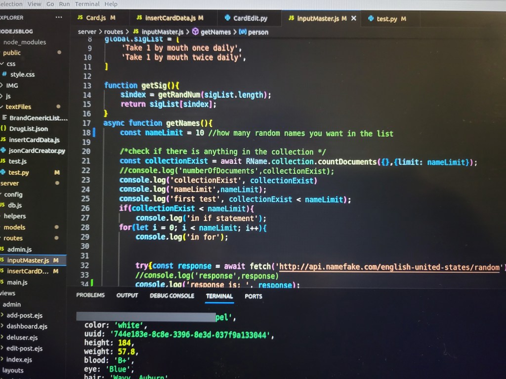 For the input master app on my pharmacy education site which is built with node/express and MongoDb I needed a bunch of random names for fake patients. I could’ve just made up a bunch of names myself but I decided to use this as a learning experience. I thought someone out there must have made a tool to solve this problem of needing random names. And I was right. I found https://en.namefake.com/api.