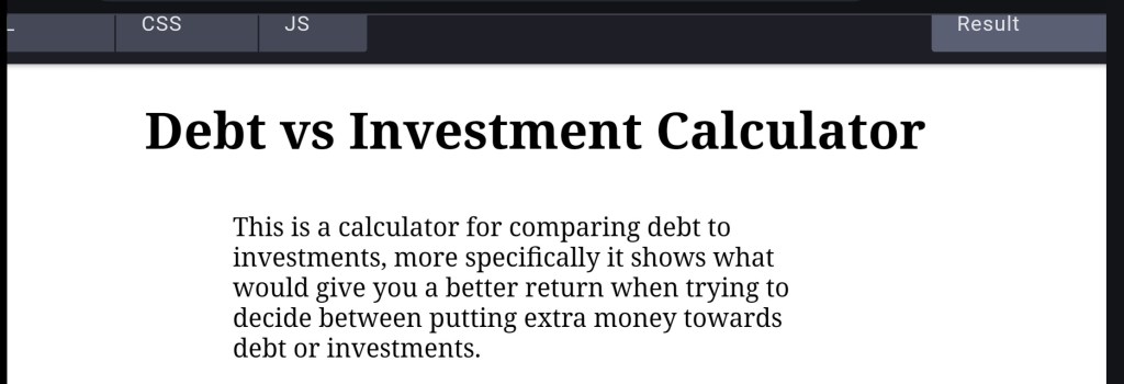 Debt vs Investment calculator was inspired by my motorcycle and calculus. I wondered whether it would be worth it to make extra payments to the loan or invest in stocks. I was studying calculus optimization problems at the time. It’s made with just HTML, CSS, and JavaScript.